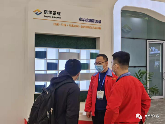 展覽會(huì)上各界人士紛至沓來(lái),京華兆建作為金屬板材涂鍍解決方案專業(yè)供應(yīng)商,在展位上部署了專業(yè)的工作人員,為來(lái)往人員進(jìn)行耐心詳盡地講解,并展示高端彩涂板系列產(chǎn)品樣板。京華兆建的生產(chǎn)產(chǎn)品涵蓋精品冷軋板、熱鍍鋅板、熱鍍鋁鋅板、高強(qiáng)結(jié)構(gòu)鋼板、建筑彩涂板、京華精品板、高端彩涂板、醫(yī)院用抗菌彩涂板、畜牧業(yè)用彩涂板、凈化板、家電用彩涂板等多個(gè)領(lǐng)域。展位E1-A02上包括且不僅限于氟碳彩涂板、抗菌彩涂板、高耐候彩涂板等擁有科技專利的高端彩涂板呈現(xiàn)。