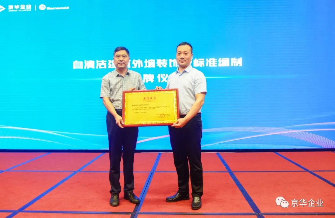 來(lái)自中國(guó)建材規(guī)劃院應(yīng)用技術(shù)開發(fā)研究院/中關(guān)村人居環(huán)境工程與材料研究院副院長(zhǎng)王忠勇先生就綠色建筑及綠色建材課題向現(xiàn)場(chǎng)嘉賓進(jìn)行了分享,并向京華企業(yè)授予 “自清潔建筑外墻裝飾板標(biāo)準(zhǔn)編制” 榮譽(yù)牌,對(duì)京華企業(yè)參與建筑板材生產(chǎn)標(biāo)準(zhǔn)編制表示鼓勵(lì)與肯定。