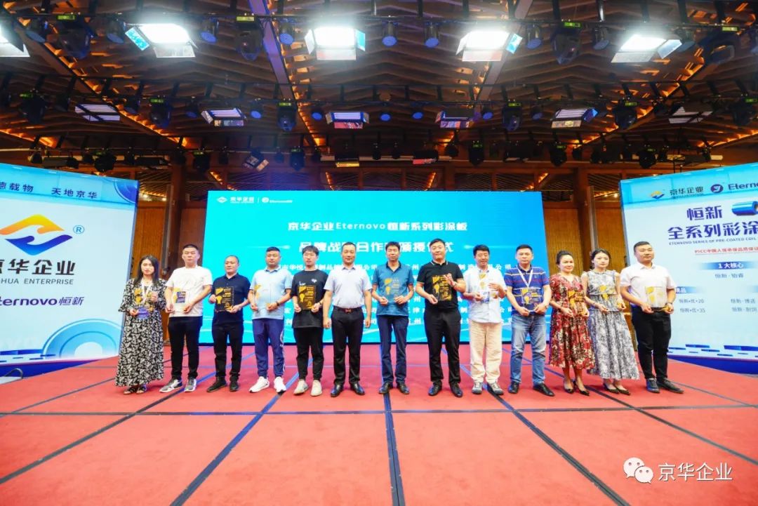 在現(xiàn)場(chǎng)300多位嘉賓的共同見證下,“恒新”品牌系列彩涂產(chǎn)品的經(jīng)銷商頒授儀式隆重舉行,京華企業(yè)總經(jīng)理陳鐵柱先生向聯(lián)合主辦會(huì)議的京津冀地區(qū)十二家經(jīng)銷商代表頒發(fā)了恒新品牌“合作共贏、共創(chuàng)未來(lái)”的授權(quán)牌,感謝大家長(zhǎng)期以來(lái)與公司戮力同心,持續(xù)提升著京華彩涂板在京津冀地區(qū)的行業(yè)標(biāo)桿形象。 京華企業(yè)與廣大客戶攜手共進(jìn),實(shí)現(xiàn)共贏共生,不斷創(chuàng)新與超越,努力鑄就綠色建材實(shí)力領(lǐng)先品牌,打造屬于整個(gè)金屬涂鍍行業(yè)的美好明天!