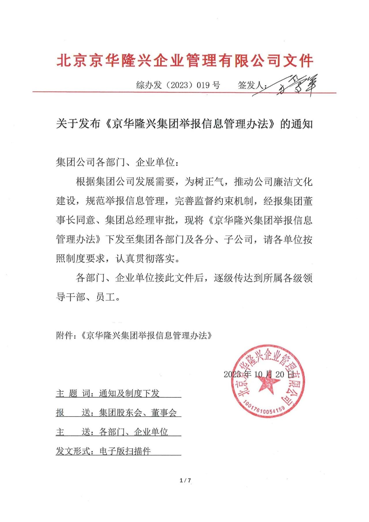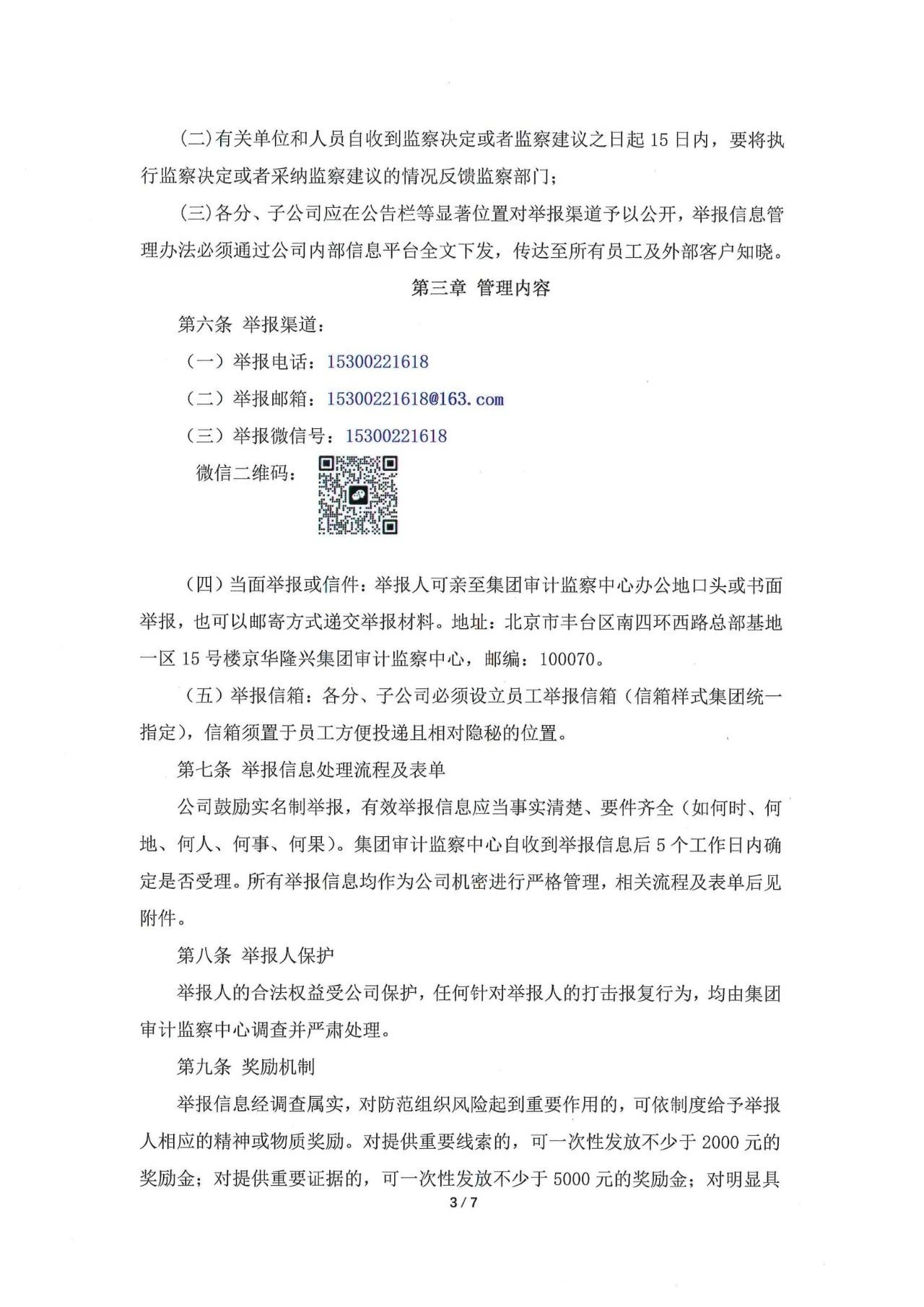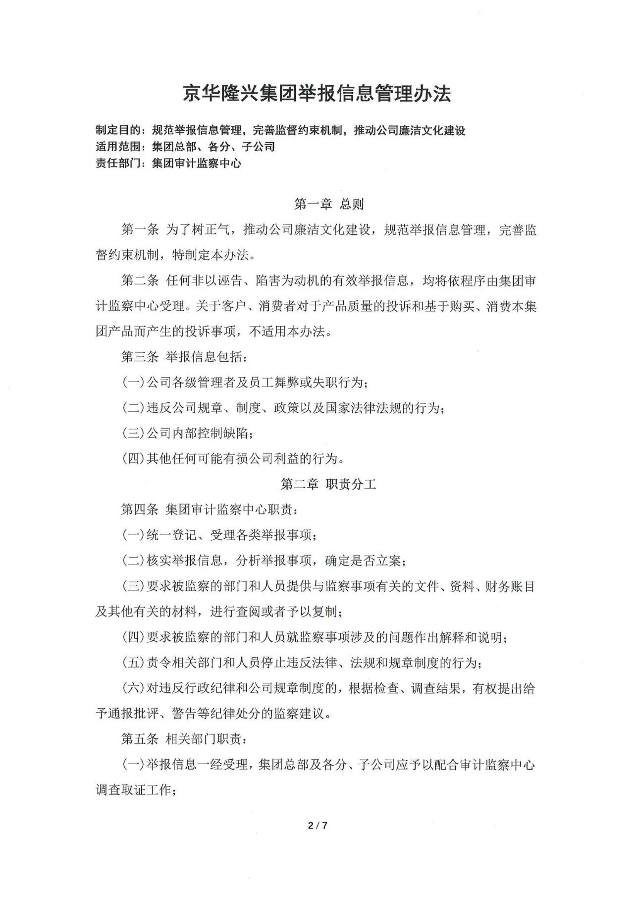 各合作單位、產(chǎn)品供應(yīng)商:根據(jù)我公司發(fā)展需要,為進(jìn)一步推動(dòng)我公司內(nèi)部的廉潔文化建設(shè),也為了保障貴單位在與我公司合作過程中的公平公正,確保合作共贏,現(xiàn)公布集團(tuán)文件《京華隆興集團(tuán)舉報(bào)信息管理辦法》,請(qǐng)各合作單位悉知。