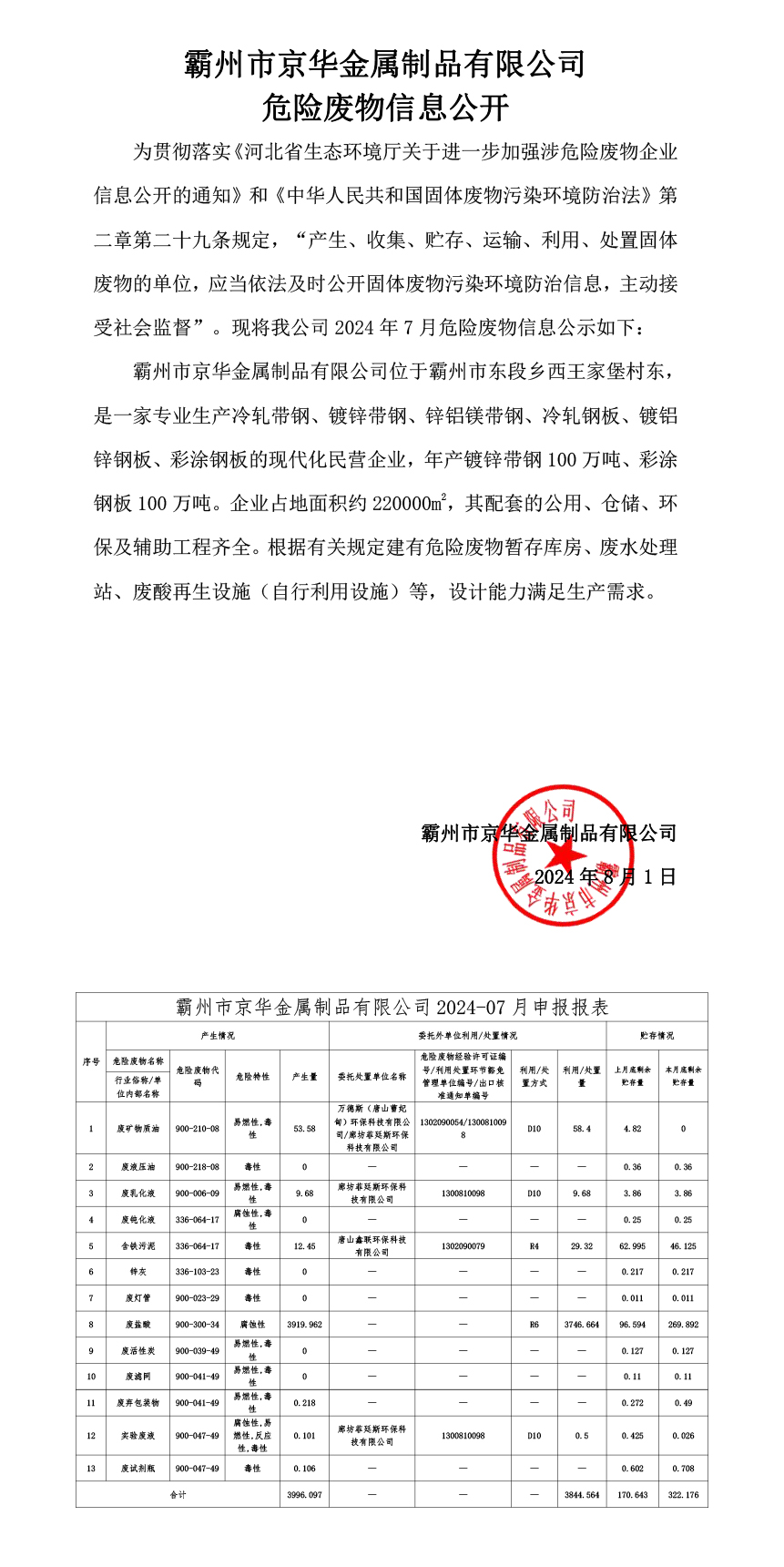 下一條:24年8月危險廢物信息公開-霸州市京華金屬制品有限公司