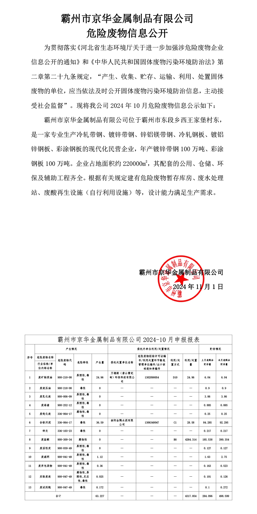 24年10月危險廢物信息公開-霸州市京華金屬制品有限公司